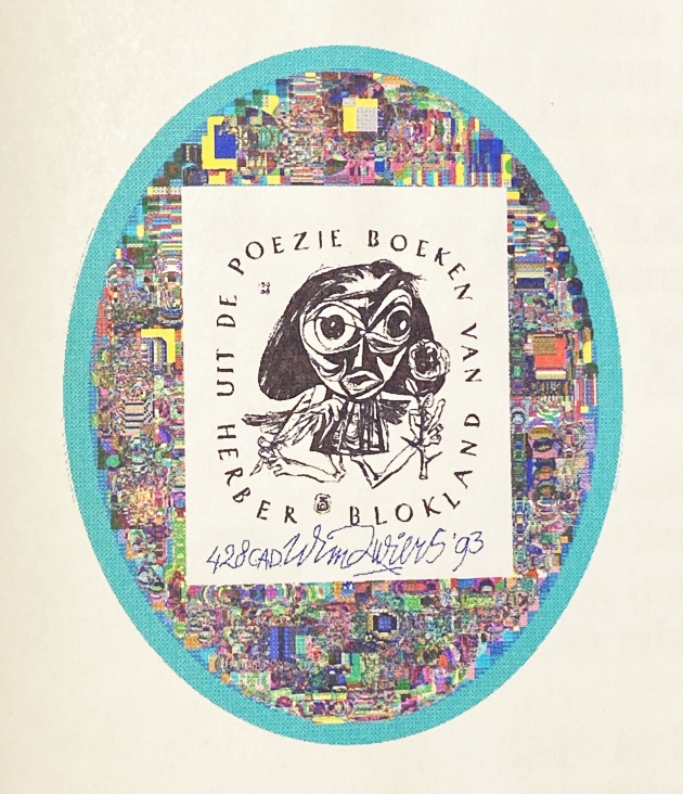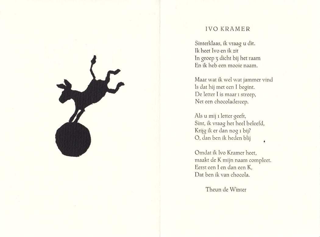 * Omvangrijk, schitterend uitgevoerd, monter boek, door de auteur op naam geschreven op het voorste schutblad. Ieder exemplaar werd voorzien van een door Jaap Schipper op de handpers gedrukte bijlage, het gedicht ‘Ivo Kramer’, een liedtekst met Sinterklaasconnectie van Theun de Winter en een originele linosnede van Iris Le Rütte. Het is een op de pers genummerd vouwblad (waarvan het nummer correspondeert met het nummer in het boek), gezet uit de Meidoorn en gedrukt op Losin.