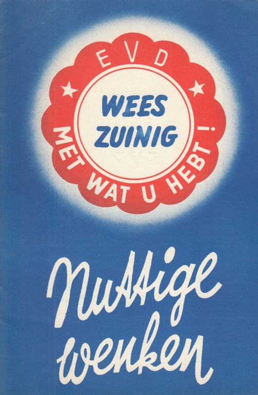 14. (HUISHOUDEN). ECONOMISCHE VOORLICHTINGSDIENST Wees zuinig met wat u hebt. Nuttige wenken. [Den Haag], Departement van Handel, Nijverheid en Scheepvaart, [1941]. Geniet. 16 p. Tekst en tekeningen gedrukt in blauw en zwart. Keurig exemplaar.