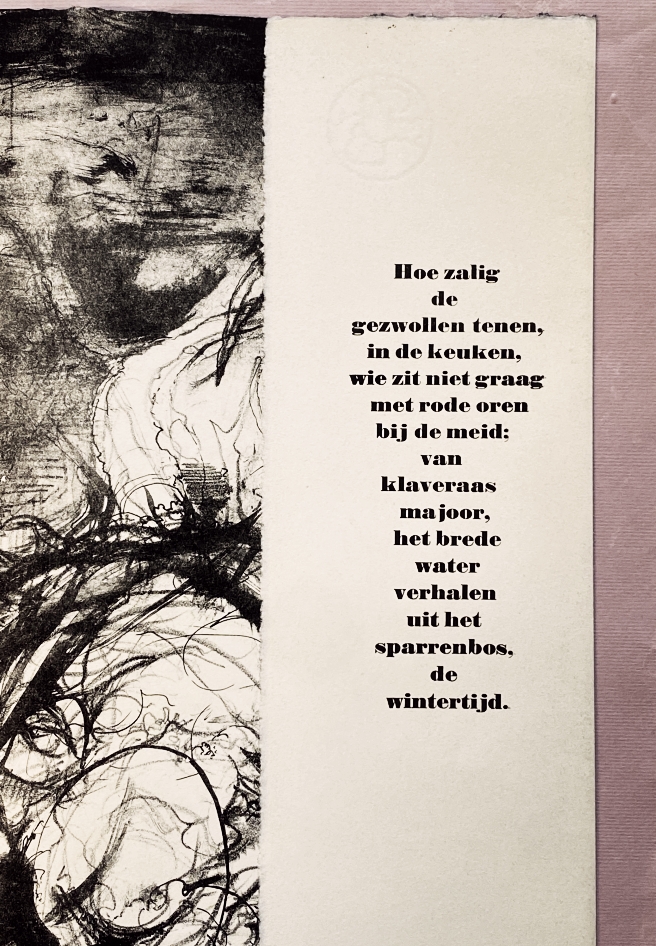* Eén van de 25 exemplaren op Gampi Vellum (een schitterend Japans papier, vervaardigd uit de bast van een wikstroemia, een soort heester). Gesigneerd door auteur en kunstenaar onder het colofon. Jaarwisselingsgeschenk 2020-2021.