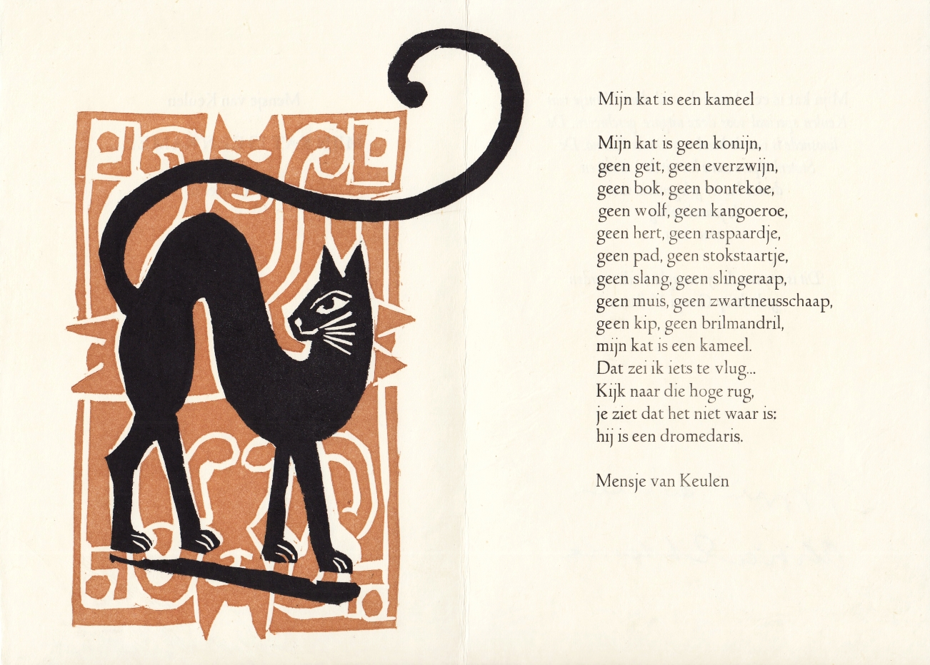 23. KEULEN, Mensje van Mijn kat is een kameel. (Met een originele tweekleurenlinosnede van Olivia Ettema). (Den Haag, Statenhofpers, 2020). Vouwblad in omslag. Met de hand gezet uit de Lutetia en gedrukt in een beperkte oplage.