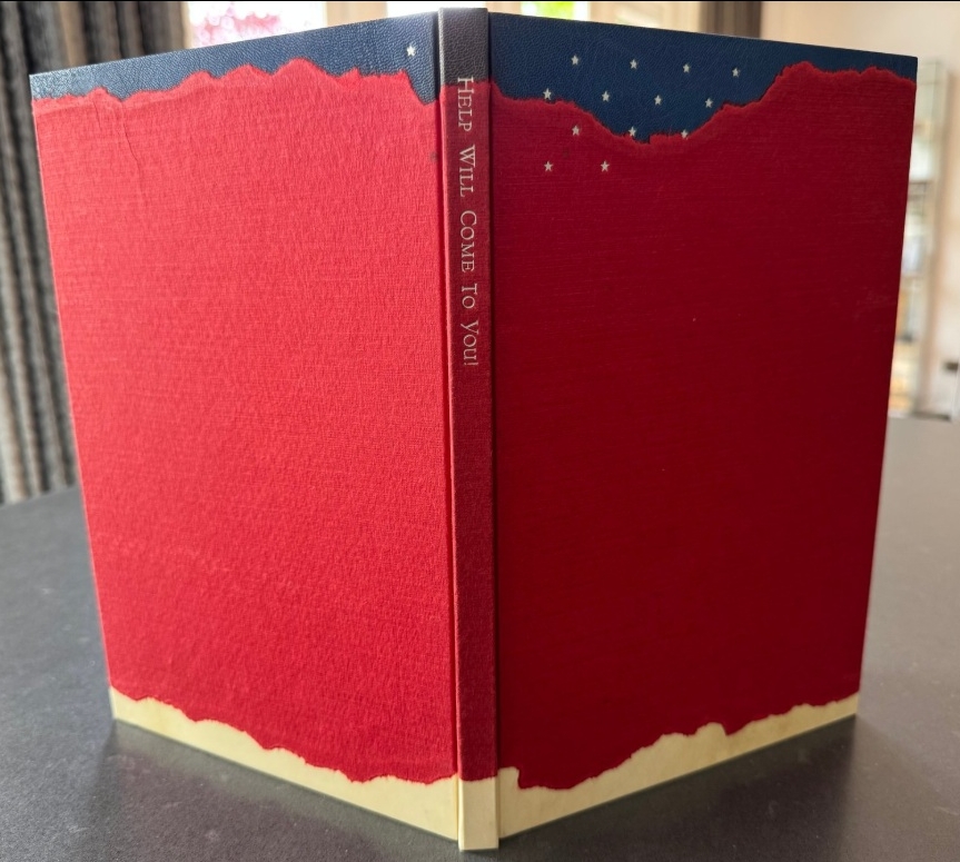 2. (BOEKBAND). ROMIJN MEIJER, Henk Help will come to you! (Ensemble van twee exemplaren: zeer luxe en ‘gewoon’) (Assen, Hein Elferink), [1991]. Blauw marokijn met Indiaas papier en perkament. In perspex cassette (Binderij Phoenix). (2), 54 p. Gezet uit de Fournier en met de hand gedrukt door Hein Elferink op Hahnemühle in rood en zwart in 70 genummerde en gesigneerde exemplaren. 1e druk.
