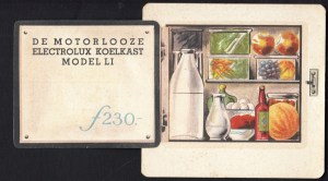15. (HUISHOUDEN). ELECTROLUX De motorlooze Electrolux koelkast model L1. Groote inhoud – Geringe afmetingen. Zonder plaats, Electrolux, [1932]. 100 x 105 mm. Boekje in de vorm van de koelkast met openklapbaar deurtje waarachter etenswaren zichtbaar worden! 10 p. Illustraties in kleuren. Lichte ouderdomssporen.