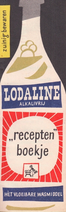 17. (HUISHOUDEN). LODALINE Lodaline alkalivrij “recepten”boekje. Hèt vloeibare wasmiddel. Breda, Loda, (ca. 1960). 14,5 x 4,8 cm. Hoog en smal boekje, geniet. 12 p. Illustraties in kleuren. Nietjesroest, verder zeer fris.