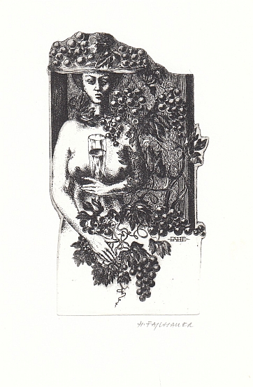 * Wijn- en andere drankgedichten van o.a. Boutens, Van Duinkerken, Engelman, Nijhoff en Vasalis. Tevens met een losse afdruk van de heel fijn getekende ets, waarop een slechts in druiventrossen geklede, strenge vrouw een glas champagne heft.