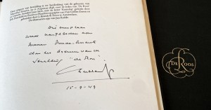 Ongenummerd exemplaar met achterin het tweede deel een opdracht van bestuurslid Chris Leeflang onder het colofon: ‘Dit exemplaar/ wordt aangeboden aan/ Mevrouw Vreede-Emants/ door het bestuur van de/ Stichting “De Roos”/ C Leeflang/ 15-9-49’. Leeflang 13.