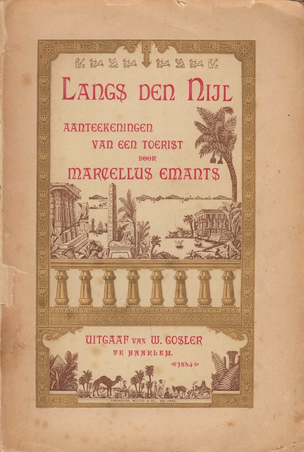 14. EMANTS, Marcellus Langs den Nijl. Aanteekeningen van een toerist. Haarlem, W. Gosler, 1884. Ingenaaid (prachtig omslag in rood, goud, bruin en zachtgroen). (8), 192 p. Achterin 8 p. uitgeversreclame, waarvan 7 uitvoerig over Henri Conscience. 1e druk. Rug ontbreekt deels, voor- en achterzijde omslag en laatste pagina’s liggen los.