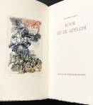 37. MANZONI, Alessandro Koor uit de Adelchi. (Vertaald door Frans van Dooren. Met een gesigneerde ets van Hedwig Pauwels). Baarn, Arethusa Pers, (1987). 29 x 20 cm. Linnen (A. Masui). (24) p. Tweetalig, Italiaans en Nederlands. Gezet uit de Centaur en gedrukt door de Clipeus Pers in een oplage van 80 genummerde exemplaren.