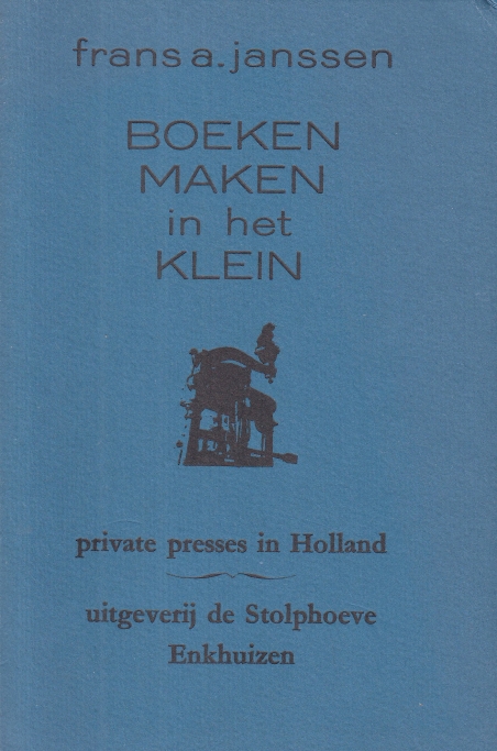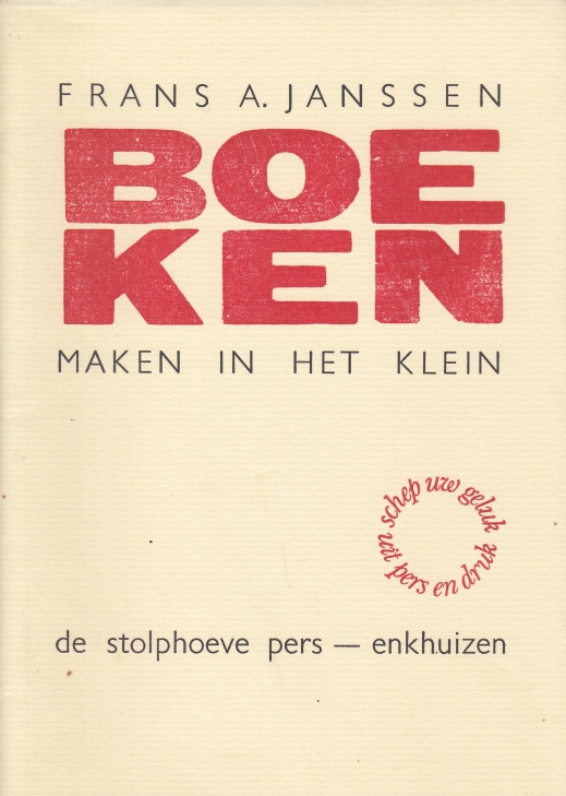 23. JANSSEN, Frans A. Boeken maken in het klein. Enkhuizen, de Stolphoeve Pers, 1984. Cahiersteek met omslag. (2), 18 p. Met de hand gezet en gedrukt in een beperkte oplage. In bijbehorende envelop. 3e (= 2e), herziene druk.