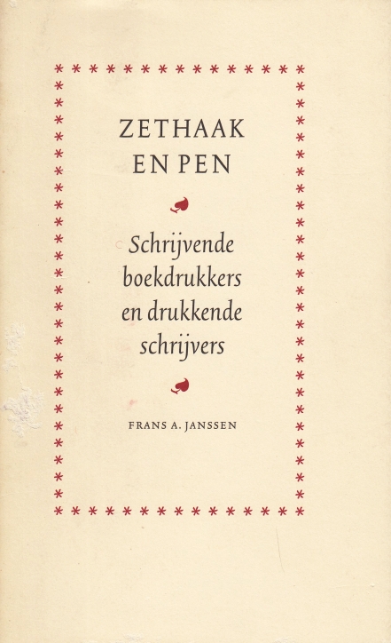 27. JANSSEN, Frans A. Zethaak en pen. Schrijvende boekdrukkers en drukkende schrijvers. Een Scaldia model. Nijmegen, Scaldia, 1984. 17 x 11 cm. Ingenaaid. 32 p. Gezet uit de Trinité 2 van Bram de Does en gedrukt in rood en zwart. 1e druk.
