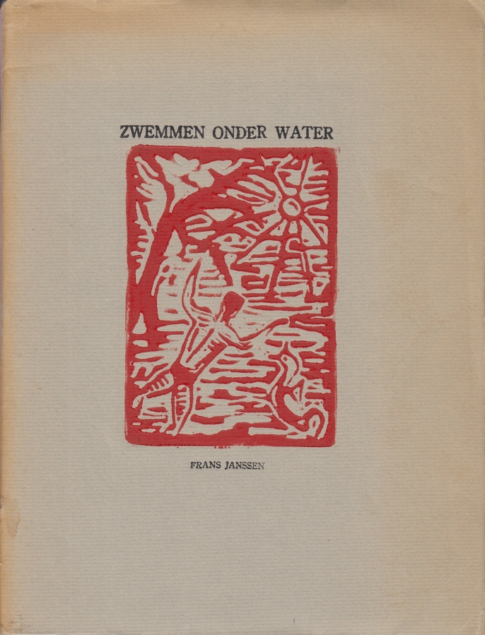 28. JANSSEN, Frans A. Zwemmen onder water. (Met houtsneden van Marcel de Glas). Amsterdam, G.Th. van Heusden, 1963. Geniet. (2), 62 p. Gestencild in een oplage van [slechts 40] genummerde exemplaren. 1e druk. Rug onderaan beschadigd.