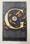 44. RAPP, Hermann 16 Buchstabenbilder. Neujahrswünsche von A bis Q für die Jahre 1978-1994. Weilrod (e.a.), Offizin Die goldene Kanne, 1977-1993. 31 x 19 cm. Elk katern bevat 4-8 pagina’s met twee of drie letterafbeeldingen in reliëf, ets, staalgravure, blinddruk, foliedruk, enz. De C ontbreekt, maar er zijn enkele aantekeningen en een houtsnede toegevoegd, en een excuusbriefje van Rapp gericht aan Huib van Krimpen. Gedrukt op (onder andere) handgeschept papier van Hahnemühle. Algemene uitvoering door Karlheinz Bölling, Hellmuth Halbach en Hermann Rapp. 1e druk. Goede staat