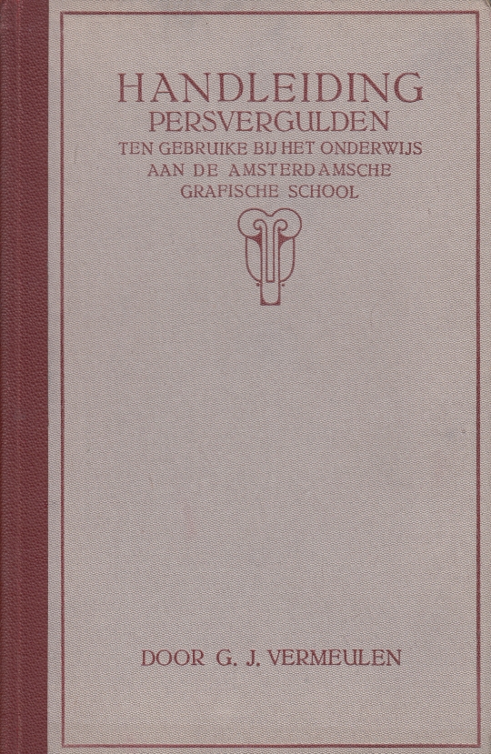 52. VERMEULEN, G.J. Handleiding persvergulden ten gebruike bij het onderwijs aan de Amsterdamsche Grafische School. Amsterdam, Amsterdamsche Grafische School, 1923. Halflinnen. 54 p. Met een losse bijlage. 1e druk. Stempeltjes van een uitgeverij, verder prima.
