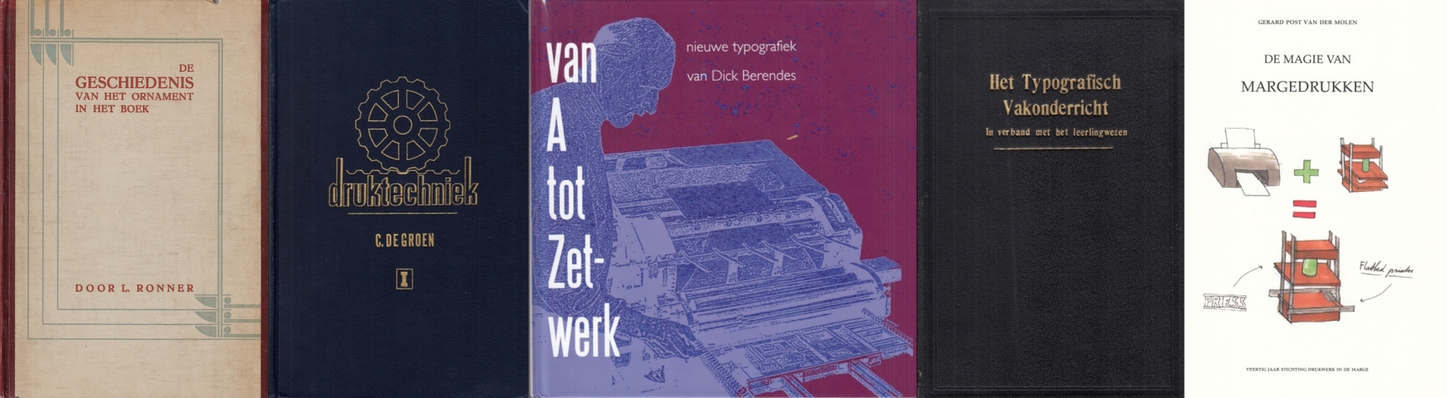 5. L. Ronner: De geschiedenis van het ornament in het boek. Amsterdam, Amsterdamse Grafische School, 1934. Halflinnen. XII, 184 p. Rijk geïllustreerd. 1e druk.