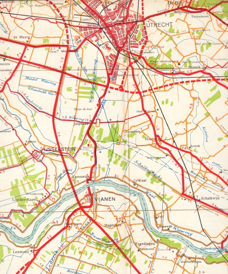 51. UTRECHT- PROVINCIE-LANDKAART Sleeswijk’s kaart van Utrecht. Naar officieele gegevens bewerkt voor wandelaars, wielrijders en automobilisten, voor school, kantoor en huiskamer. Met nauwkeurige afstandsbepaling in kilometers tusschen de plaatsen. (Ca. 1940). Den Haag, Kompas, ca. 1940. Opgevouwen maat 30 x 12 cm. Kaart 60 x 84 cm. Schaal 1:80.000. Klein vlekje, randkreukje, maar in nette staat.