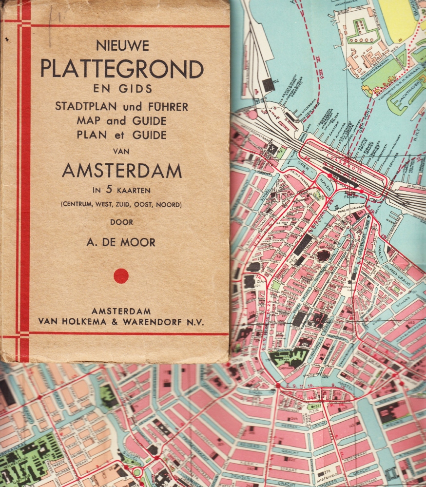 39. MOOR, A. de Nieuwe Plattegrond en gids van Amsterdam in 5 kaarten (centrum, West, Zuid, Oost, Noord) / Stadtplan und Führer / Map and Guide / Plan et Guide. Amsterdam, Van Holkema & Warendorf N.V., [1936]. 18,5 x 12 cm. 5 uitklapkaarten geplakt in omslag, met Lijst van Grachten, Kaden, Pleinen, Straten, enz. Ook met Dienstregeling Openbaar Vervoer en overzicht van bezienswaardigheden met hun prijzen (40 p. totaal). Advertenties op de kaartbladen en het omslag. 1e druk. Omslag met lichte gebruikssporen, 1e kaart ligt los. Met handgeschreven jaartallen 1943.