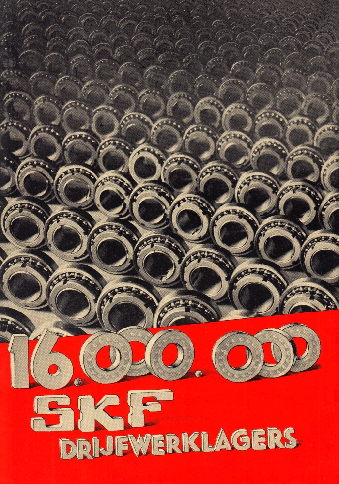 * Mooie vormgeving van deze technische handelscatalogus. Inliggend van dezelfde fabriek (de Svenska Kullagerfabriken) : 16.000.000 SKF drijfwerklagers. Zelfde uitgever, 1938. Geniet. 8 p. Reclamefolder gedrukt in rood en zwart. Zeer fraaie vormgeving, zie afbeeldingen.