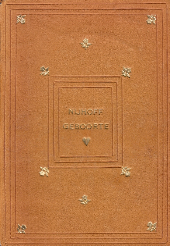 40. NIJHOFF, A.H. Geboorte. [Amsterdam], (De Bezige Bij, 1945). Heelleren privéband. Voorzijde omslag meegebonden. 44 p. Gezet uit de Erasmus Mediaeval en gedrukt in een oplage van 525 genummerde exemplaren. 1e druk. Rugje iets versleten. Voorin een onleesbare naam en de datum 27 October 1945.