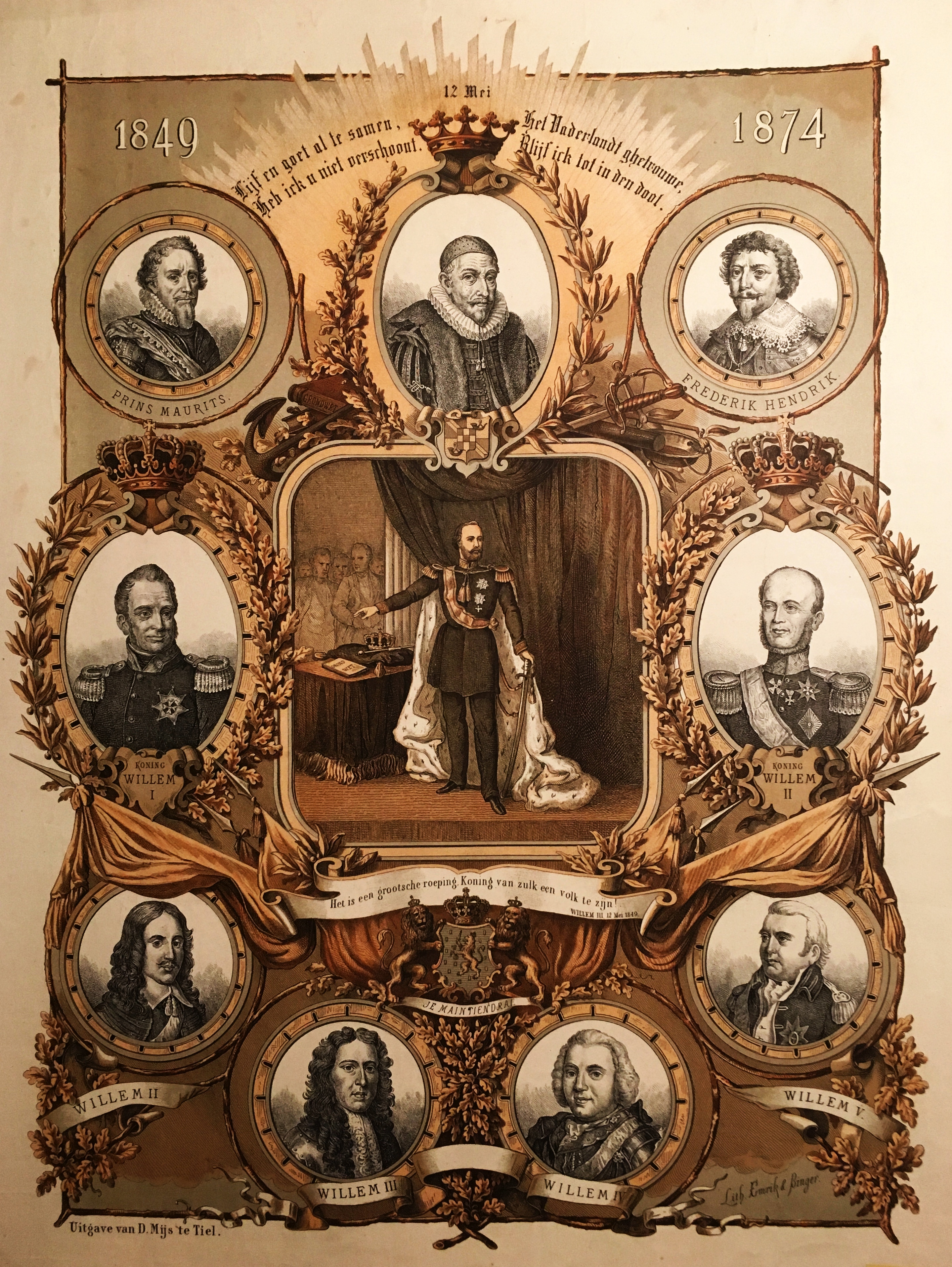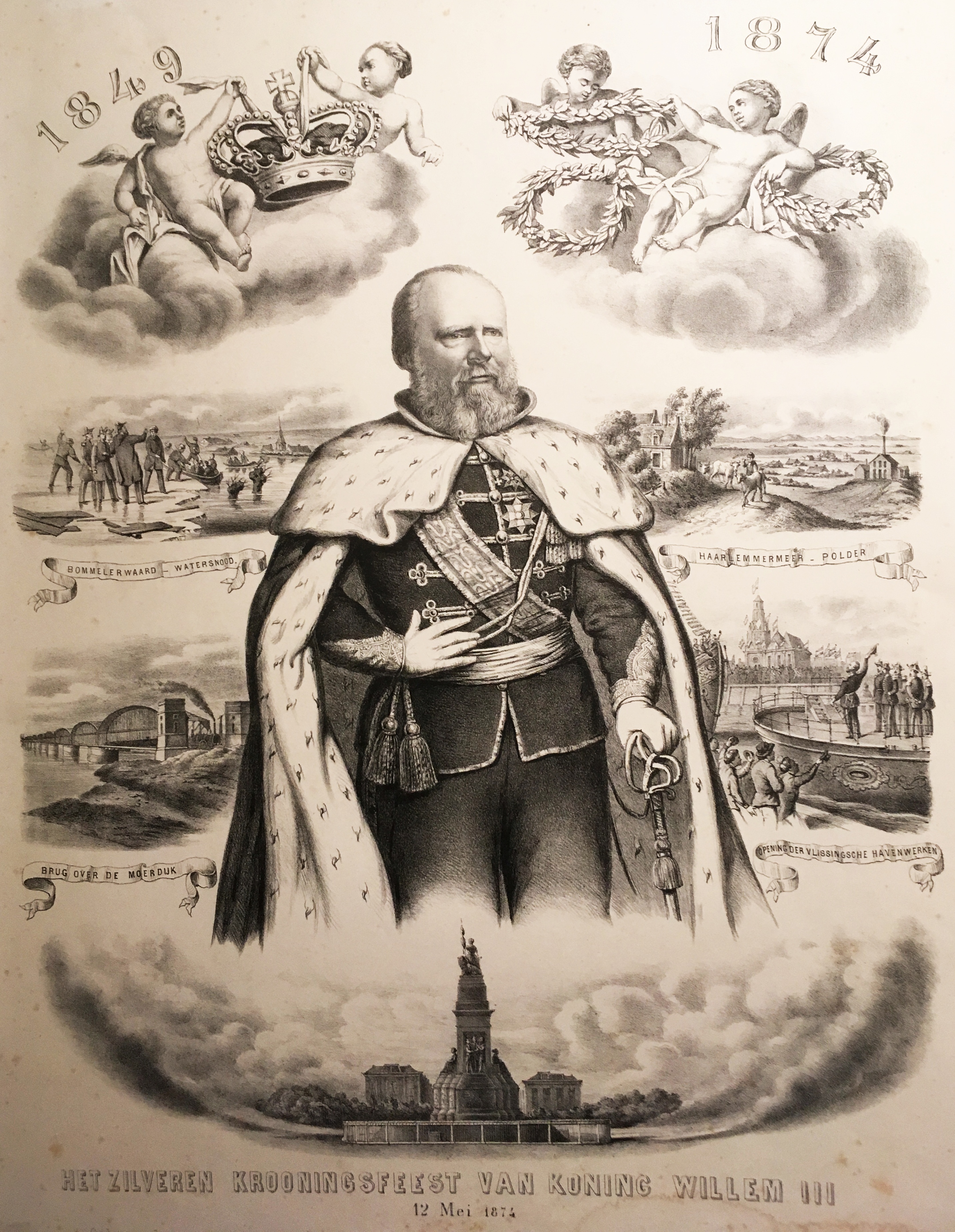 1. Den Haag, Ch. van Lier, 1874. 65 x 48 cm. Lithografie, eenzijdig gedrukt. Hoekje ontbreekt, wat roest. Koning Willem III in zijn hermelijnen mantel omgeven met een afbeelding van de watersnood in de Bommelerwaard, de inpoldering van de Haarlemmermeer, de brug over de Moerdijk, de opening der Vlissingse Havenwerken en het monument op het Plein 1813. En een stel gezellige putti.