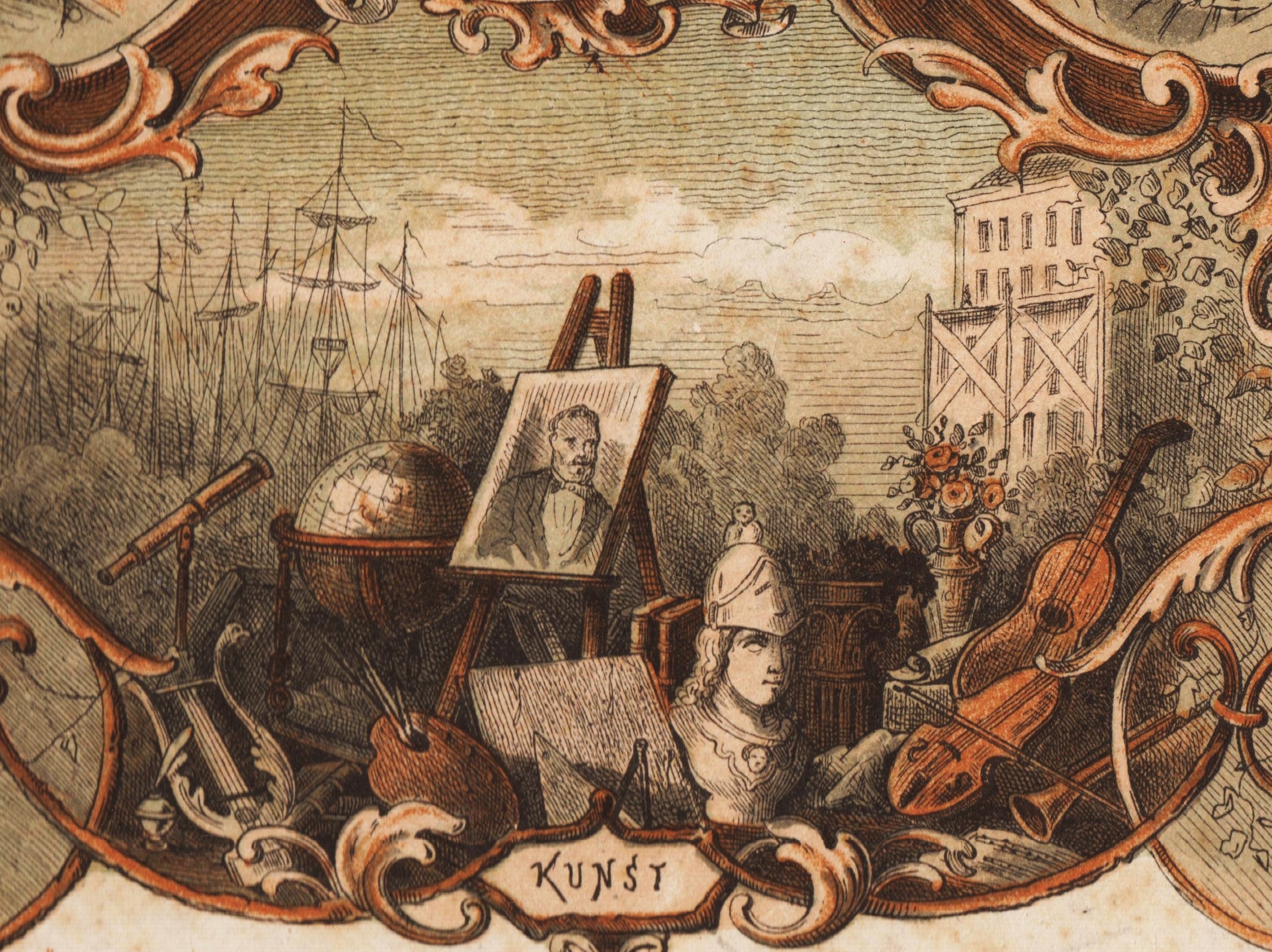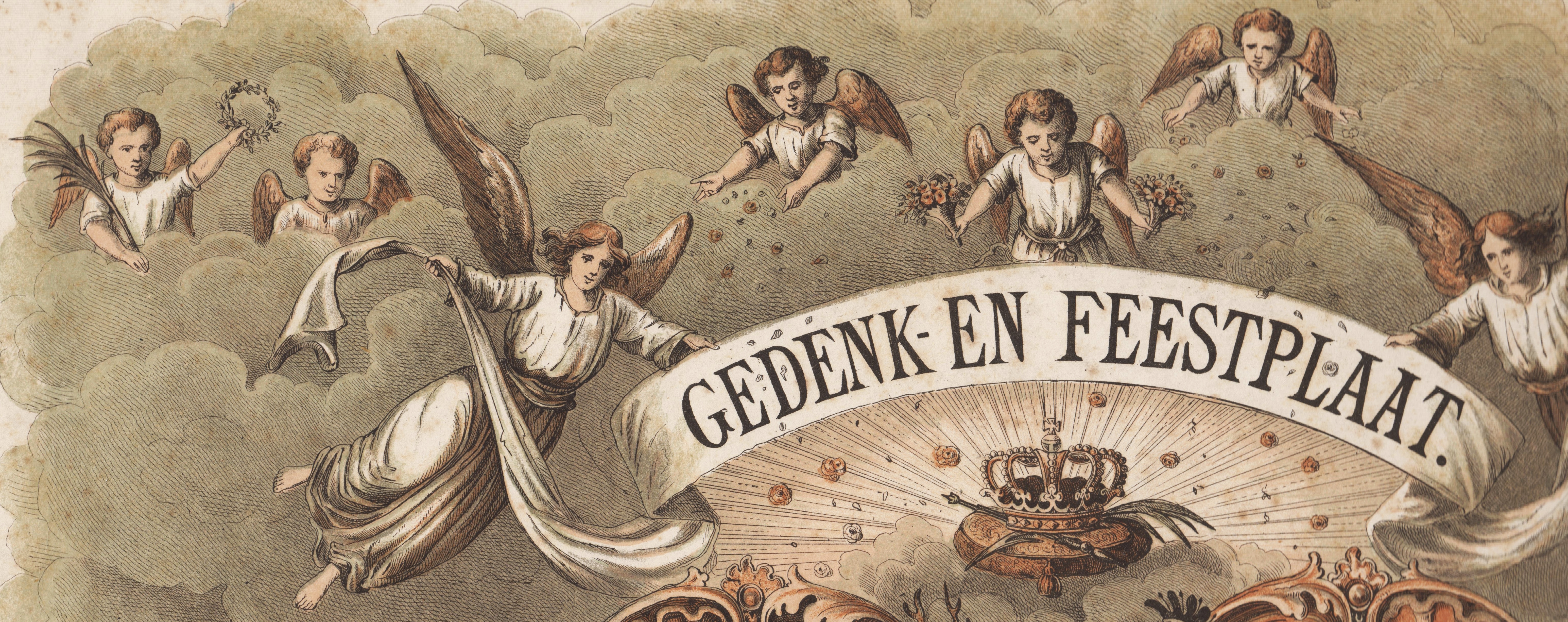 2. H.J. van LUMMEL, Neêrlands zilveren vreugdedag (12 mei 1874). Opgedragen aan Zijne Majesteit den Koning. Amsterdam, Tresling & Co., 1874. 53 x 67 cm. Grote getinte litho met afbeelding van de kroning van koning Willem III, van Bronbeek, de herdenking van de inname van Den Briel en van de overstroming bij Leeuwen. Met achtregelig gedicht van Isaac da Costa: ‘Den heer der legerscharen’.