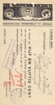 13. DE WAPENS NEDER Kwitantie voor een abonnement op De Wapens Neder, Maand-orgaan van de Internationale Anti-Militaristische Vereeniging in Nederland, 1919. Den Haag, De Wapens Neder, 1919. 20 x 18,5 cm. Biljet, eenzijdig bedrukt. Kopvignet gesigneerd ‘T.v.T.’. Invulformulier voor een abonnement van 55 cent. Met de naam van J.H. van Ankoren te Steenwijk en de handtekening van administrateur Johnnie Harinck te Den Haag. Twee stempels met datering in mei 1919. Geperforeerd in de rand van de kop. Verticale vouw.