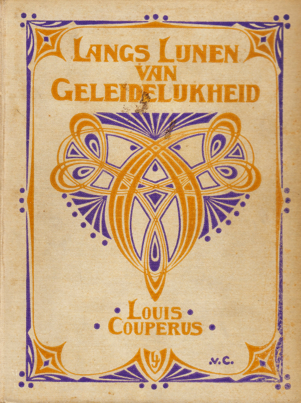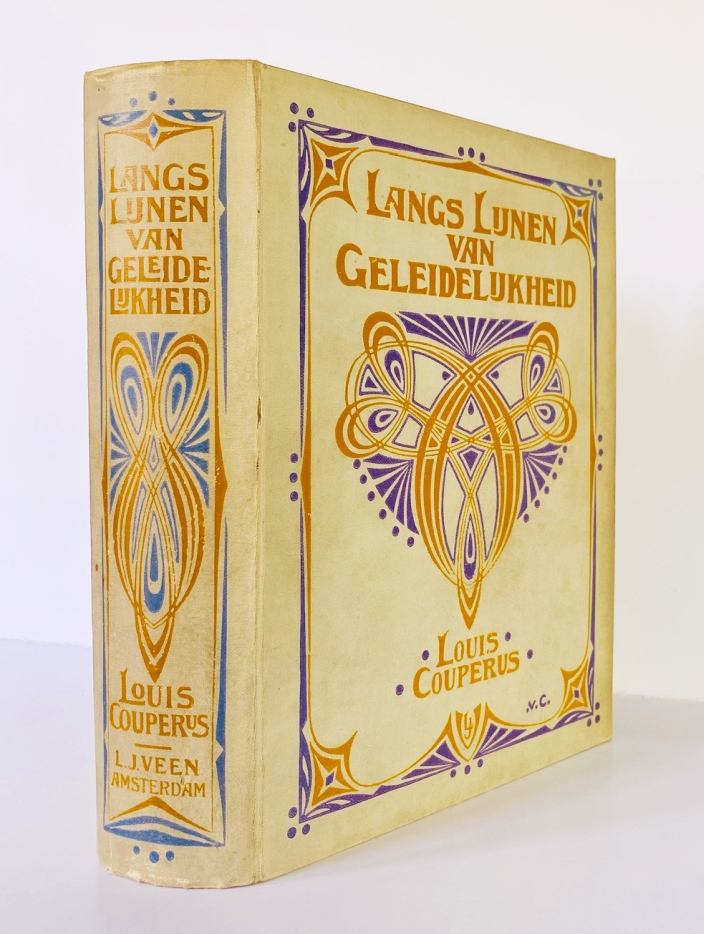 5. COUPERUS, Louis Langs lijnen van geleidelijkheid. Amsterdam, Veen, [1900]. Gedecoreerd linnen (ontwerp J.G. van Caspel). (4), 240; (4), 216 p. 1e druk. Rug wat verkleurd. Voorschutblad uitgescheurd. Buitenste bladen wat roestig.