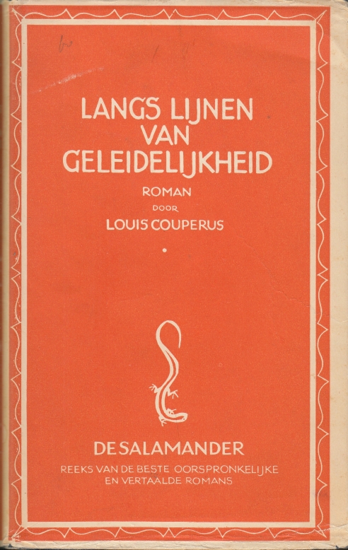 11. COUPERUS, Louis Langs lijnen van geleidelijkheid. Amsterdam, Querido, 1935. Linnen met dubbel stofomslag. 264 p. 2e druk. Oranje omslag wat gerafeld. Portretje voorin geplakt, stempeltje op schutblad.
