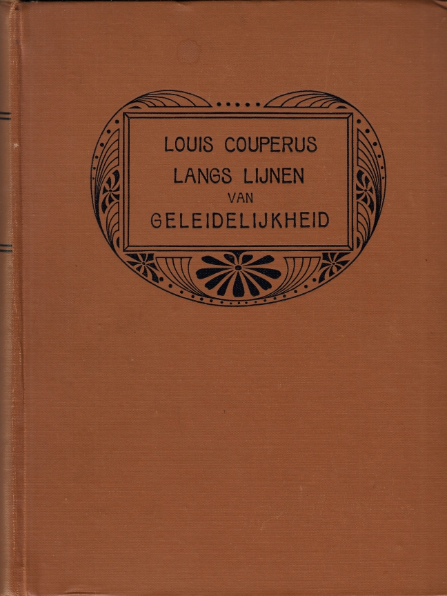 9. COUPERUS, Louis Langs lijnen van geleidelijkheid. Amsterdam, Veen, [1900]. Latere bruin linnen band met jugendstilkader (rond 1919?). (4), 240, 216 p. Boekblok schoongesneden. 1e druk. Keurige band. Titelblad roestig, verder mooi.