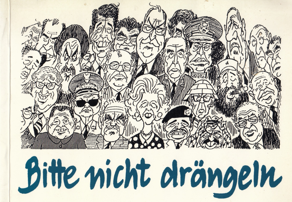 * Exemplaar met handgeschreven, gesigneerde opdracht van de tekenaar op de titelpagina: ‘Voor Ivan [Sitniakowsky] met vele goede/ wensen/ Fritz/ 27.1.89/ F. Behrendt’. Fritz Behrendt was vele jaren politiek tekenaar bij De Telegraaf, waar Sitniakowsky de culturele redactie bestierde. Niet in Nederlandse bibliotheken: het is een oorspronkelijk Duits boek van de in Duitsland geboren Behrendt (1925-2008), die als kind met zijn familie het Nazi-rijk moest ontvluchten. De titel betekent ‘Niet dringen alstublieft’. (Kent u ze nog, de circa 27 politici op bovenstaande tekening? Oplossing (grotendeels) onderaan de pagina)