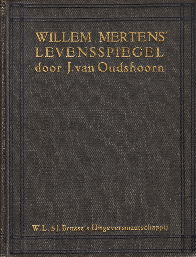 26. OUDSHOORN, J. van Willem Mertens’ levensspiegel. Rotterdam, W.L. & J. Brusse, 1914. Linnen. (4), 200 p. [Gedrukt in een oplage van 500 exemplaren, waarvan slechts 100 zijn gebonden]. 1e druk. Debuut. Naamstempeltje op titel. Keurig.