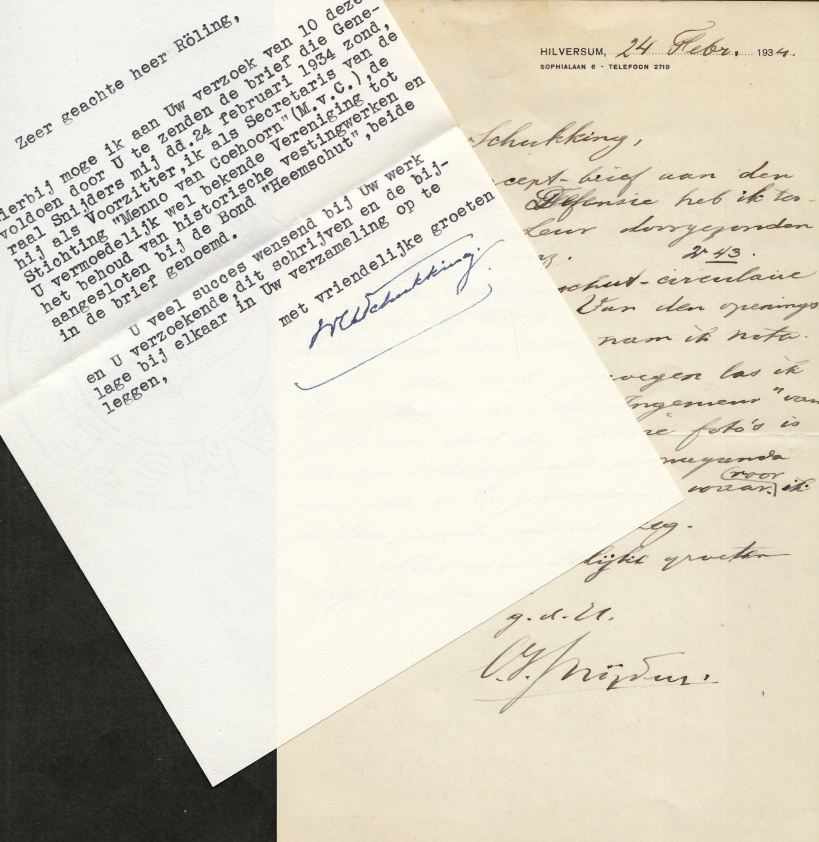 * Generaal Snijders (1852-1939) was van 1914-1918, dus tijdens de Eerste Wereldoorlog, opperbevelhebber van de Nederlandse Land- en Zeemacht. In de jaren dertig was hij een van de gangmakers van de politieke beweging Verbond Nationaal Herstel, die we in deze nieuwsbrief al eerder zijn tegengekomen. Snijders schrijft in zijn hoedanigheid als (de allereerste) voorzitter van de stichting Menno van Coehoorn aan Schukking, die er secretaris van was, over de Bond Heemschut. Ook prijst hij Schukking als auteur van een artikel over Menno van Coehoorn. Willem Hendrik Schukking (1882-1967) was de eerste Nederlander die een zweefvlucht maakte, in 1908 met een door hemzelf gebouwd zweefvliegtuig.