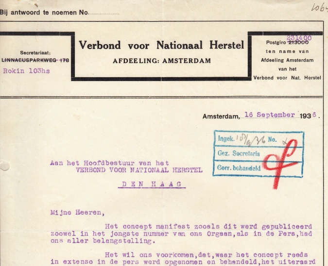 31. QUANT, L.J. Getypte, gesigneerde brief aan het Hoofdbestuur van het Verbond voor Nationaal Herstel, gedateerd ’16 September 1936′. Op briefpapier van het ‘Verbond voor Nationaal Herstel afdeeling Amsterdam’. 15 regels. Vouwtjes en twee perforatiegaatjes. Geparafeerd archiveringsstempel van het Hoofdbestuur.