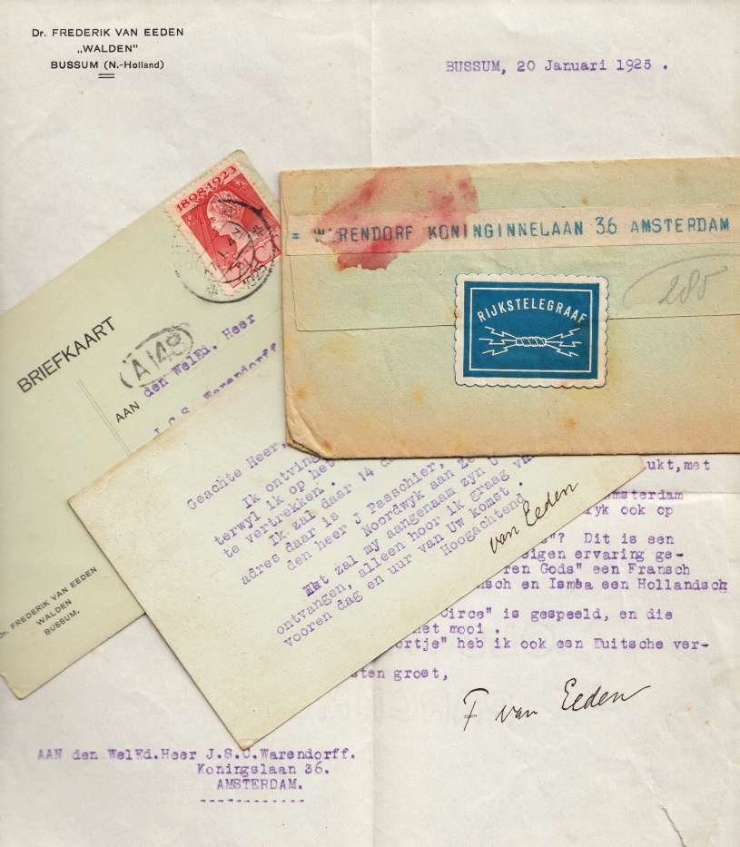 14. EEDEN, Frederik van Getypte brief, drie briefkaarten en een telegram aan J.C.S. Warendorf. 1923-1925.