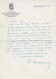 * Bijzondere collectie! Prof. B.V.A. (Bert) Röling (1906-1985) was hoogleraar volkenrecht en polemologie. In Groningen zette hij het Instituut voor Polemologie op. Deze brieven zijn gericht aan een jeugdig familielid, Theo, die nog op de middelbare school zat en in 1961 vermoedelijk zestien was. Deze achterneef, de kleinzoon van een broer van Bert Rölings ouders, zou een groot verzamelaar van foto’s en handschriften van bekende personen worden, en schreef al jong aan zijn beroemde familielid. Als verre verwanten kenden ze elkaar niet, maar prof. Röling is welwillend en schrijft de jongen ondanks zijn drukke bezigheden een aantal brieven. Hij helpt Theo aan een radiolezing en zelfs aan een artikel om in de schoolkrant te plaatsen, niet onbelangrijk, een artikel over de moord op John F. Kennedy op 22 november 1963.