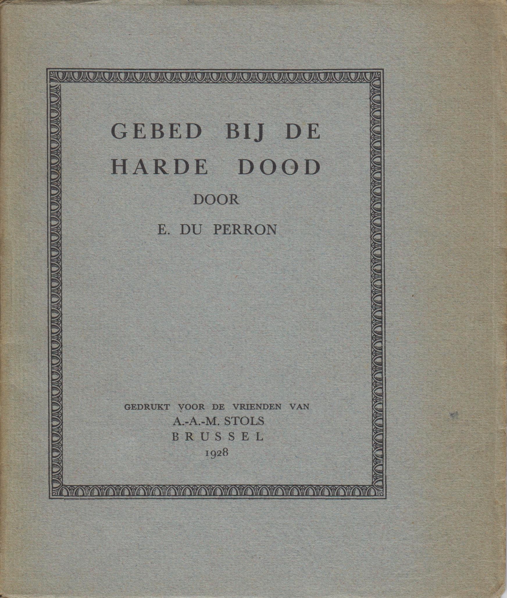 32. PERRON, E. du Gebed bij de harde dood. (Oplage 50 exemplaren). Brussel, A.A.M. Stols, 1928. Ingenaaid met omslag. (4), 20 p. Gedrukt in een oplage van 50 genummerde exemplaren. 1e druk. Achterzijde omslag heeft een kleine beschadiging, verder prima. Exlibris.