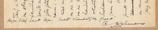 50. WICHMANN, Clara Twee gesigneerde, handgeschreven brieven aan dr. A.J. Resink. Beide meten 26,0 x 21,3 cm. De tweede is oblong en in het midden gevouwen. Tweezijdig beschreven. Gedateerd ‘Haag, v.-Boetzelaerlaan 37/ 21 april 1920’ en ‘Haag, 11 Juni ’20./ Obrechtstr. 245’. Opgeplakt aan beide zijden van een albumblad, maar vrijwel geheel leesbaar. 40 r. en 85 r.