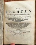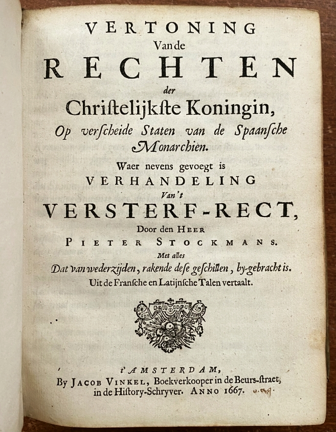 8. (DEVOLUTIEOORLOG van 1667-1668). STOCKMANS, Pieter Vertoning van de Rechten der Christelijkste Koningin, op verscheide Staten van de Spaansche Monarchien. Waer nevens gevoegt is Verhandeling van ’t Versterf-rect, met alles dat van wederzijden, rakende dese geschillen, by-gebracht is, uit de Fransche en Latijnsche talen vertaalt. (Bijgebonden: andere werken m.b.t. de Devolutieoorlog van 1667-1668). Contemporain perkament met handgeschreven rugtitel: ‘Stockmans Versterf Regt’. 156; 100 p. Voorafgegaan door twee blanco bladen. Wat stoffig en gevlekt.