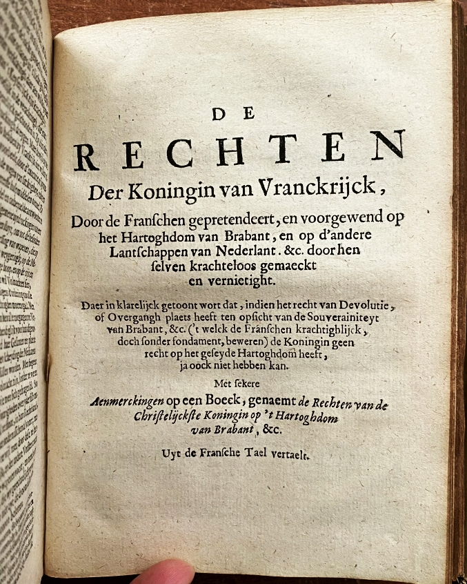 1. Deductie, waar uyt met klare ende bondige bewijs-redenen getoont en beweesen wordt, datter geen Recht van Devolutie is, in het Hertogdom van Brabandt. Amsterdam, Jacob Vinckel, 1667. 52 p.
