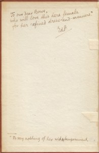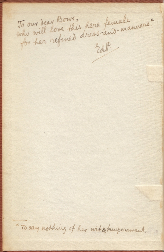 * Op de binnenkant van het voorplat staat een handgeschreven opdracht van E. du Perron aan Everard Bouws: ‘To our dear Bows,/ who will love this here female/ for her refined dress-and-manners. / EdP./ To say nothing of her wit & temperament.’ Het omvangrijke boek is de autobiografie van een Engelse courtisane (1786-1845).