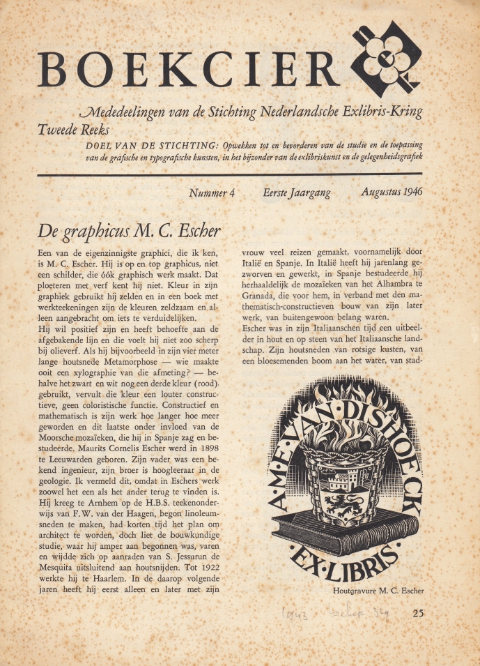 11. (ESCHER, M.C.). G.H. ‘s-GRAVESANDE ‘De graphicus M.C. Escher’. In: Boekcier. Tijdschrift van de Stichting Nederlandsche Exlibris-Kring. Tweede Reeks, jaargang 1, nr 4 (augustus 1946). Zonder plaats, Stichting Nederlandsche Exlibris-Kring, 1946. Twee gevouwen bladen, (8) p. genummerd 25-32. Met drie afbeeldingen van houtgravures van M.C. Escher, een van Th. Haanebrink en een van E. Reitsma-Valença. Roestspikkels. Met lichte potloodnotities van het jaar en het Locher-nummer van de drie Escher-exlibris.