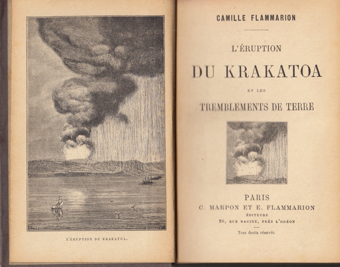 12. FLAMMARION, Camille L’éruption du Krakatoa et les tremblements de terre. Paris, Marpon et Flammarion, [1890]. 16 x 10 cm. Versierd donkergrijs linnen. (4), 254 p. Geïllustreerd met kaartjes en houtgravures. Prima staat.