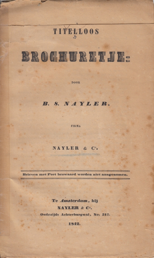 20. NAYLER, B.S. Titelloos brochuretje. Amsterdam, Nayler & Co., 1842. 16 p. in elkaar gevouwen. 1e druk. In de rug met scotch tape verstevigd. Boven de titel is een onbedrukte reep papier afgeknipt. Wat verbruind en roestig, enkele scheurtjes. Enkele potloodstrepen.