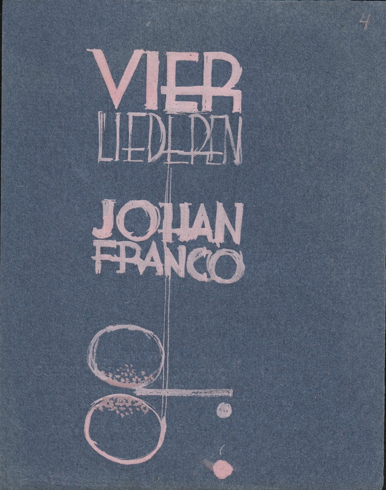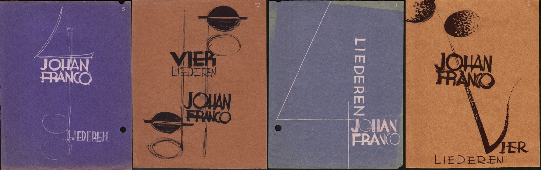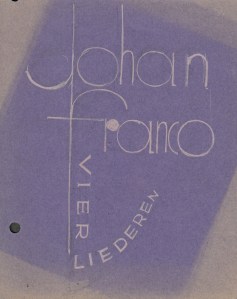 (KET, Dick). (M. NIJHOFF). Johan FRANCO Vier liederen voor sopraan en piano. (Op muziek gezet door Johan Franco). Amsterdam, Broekmans en Van Poppel, [1937]. 33,5 x 26 cm. 18 (= 16) p. Omslagontwerp door Dick KET. In druk opgedragen ‘à Madame Eva Gauthier/ à la mémoire de Claude Debussy’. Notenbalken met tekst naar kalligrafisch handschrift. Aan het eind gedateerd ‘A’veen 1936-1937’. Blijkens een ingeplakt adresetiketje is dit wellicht het exemplaar van de componist, Johan Franco.