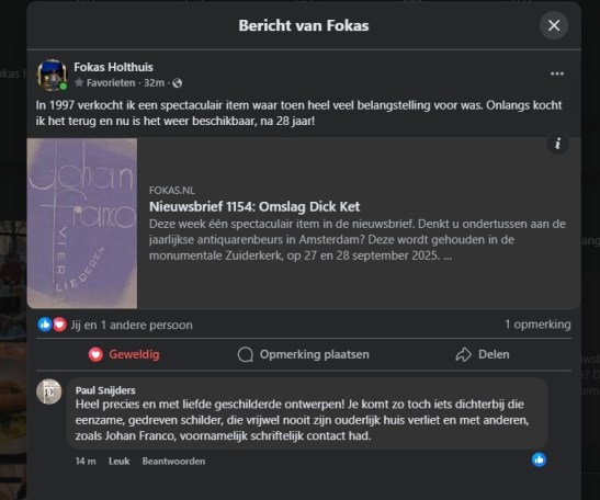 De schilder Dick Ket (1902-1940) werd vooral bekend om zijn stillevens en zelfportretten, maar hij blijkt ook een groot typografisch talent te zijn geweest. Franco (1908-1988) en Dick Ket waren bevriend en correspondeerden veel met elkaar. Johan Franco, zoon van de kunstschilderes Meta Cohen Gosschalk, studeerde van 1929-1934 aan het Conservatorium van Amsterdam, onder anderen bij Willem Pijper.