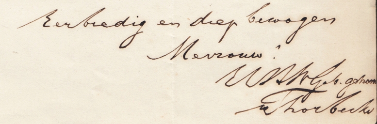 14. THORBECKE, J.R. Handgeschreven, gesigneerde condoleantiebrief aan mevrouw G. Huyssen van Kattendijke-van Nagell, gedateerd ‘Dep.v. BZ./ 8 feb.1866’ en getekend ‘Eerbiedig en diep bewogen/ Mevrouw!/ (…)/ Thorbecke’. Dubbel blad. 27 x 21 cm. Alleen beschreven op de eerste pagina. In donkerbruine inkt. 15 regels. Gevouwen en met wat kreukels.