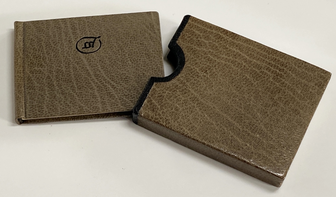 2. GRAY, John Passing the Love of Women. Sub Signo Libelli, 1979. Oblong 40 x 55 mm. Mole gray full leather with a black lined grey leather covered slipcase. An SSL monogram is stamped on the front cover, and a tiny title on the spine. (24) p. Hand-set and printed in an edition of only 12 (twelve) numbered copies. Fine.