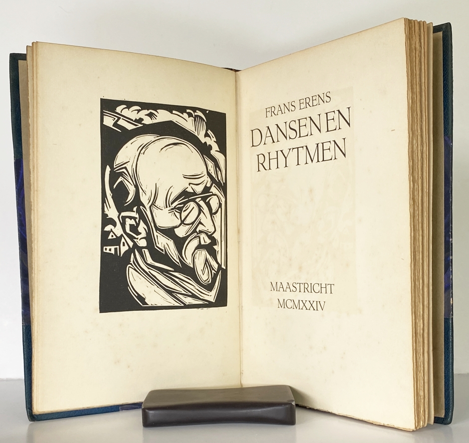 8. ERENS, Frans Dansen en rhytmen. (Met een houtsnede door Henri Jonas). Maastricht, (Nypels), 1924. Verguld halfleder met gemarmerde platten (Jan Wansink). 94 p. Gezet uit de Erasmus en met initialen van S.H. de Roos. Gedrukt onder typografische leiding van Charles Nypels in rood, lichtblauw en zwart in een oplage van 220 genummerde exemplaren. 2e druk, waaruit ‘Berbke’ werd weggelaten, maar waar ‘De conferentie’ aan werd toegevoegd. Band deels wat verschoten, een paar schaafplekjes aan de rug.