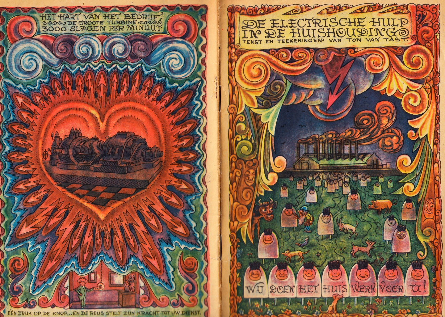23. (HUISHOUDEN). TAST, Ton van De electrische hulp in de huishouding. Tekst en teekeningen van Ton van Tast. Rotterdam, N.V. Moonen & Van Pelt’s Handelsdrukkerij, ca. 1930. Geniet. 24 p. Rijk geïllustreerd. 2e aangevulde druk met geheel nieuwe prentjes. Scheurtje in voorblad, verder mooi.