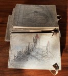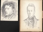18. DE MOT, Jean Croquis. (Zes originele schetsboekjes met tekeningen. 1894-1912). Zes in linnen gebonden schetsboekjes met lint, iets verschillende formaten (grootste: 14 x 21 cm). Deels gevuld met tekeningen, schetsjes en krabbels in potlood en krijt, enkele in inkt of aquarel, deels blanco gebleven. Afhankelijk van uw definitie van een tekening en een krabbel bevatten de boeken samen ca. 100-150 tekeningen. Enkele zijn voorzien van plaatsnaam, woorden of een jaartal, o.a. Hildesheim, Bonn, Davos, ‘Ma chambre’, en de jaartallen 1894, 1897 (mogelijk 1891). In een van de boekjes zijn enkele losse blaadjes ingelegd met daarop schetsen van naakten, meisjesportretten en een kopie naar een beeldje van Jean-Baptiste Carpeaux met daaronder in kinderlijk handschrift ‘le 24 Aôut 19-12/ Carpeaux papa et Eléonore’. De banden hebben inktvlekken en gebruikssporen, maar verder zijn de boeken in goede staat.