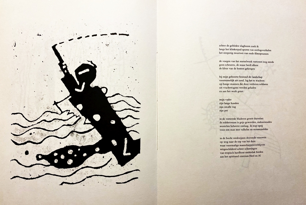 36. HEINE, Heinrich Reinigung. Die Nordsee. [Geesbrug], Sub Signo Libelli, 2001. Vouwblad in omslag. Verlucht met een typografische illustratie. Gezet uit de Romanée en gedrukt in groen en zwart ter gelegenheid van de 55e verjaardag van margedrukker Doortje de Vries. 45 exemplaren werden opgenomen in de ter harer ere uitgebrachte jubileumdoos Adooratie; enkele werden voorzien van een speciaal met rode inkt gedrukt omslag, met voorop het monogram ‘gk’ (ontworpen door Helmut Salden).