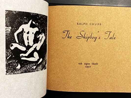 34. CHUBB, Ralph The Shipboy’s Tale. (Met 4 illustraties van de auteur. [Amsterdam], Sub Signo Libelli, 1977. Origineel omslag. (4), 24 p. Met de hand gezet en gedrukt op Hahnemühle Ingres-papier in 40 genummerde exemplaren.